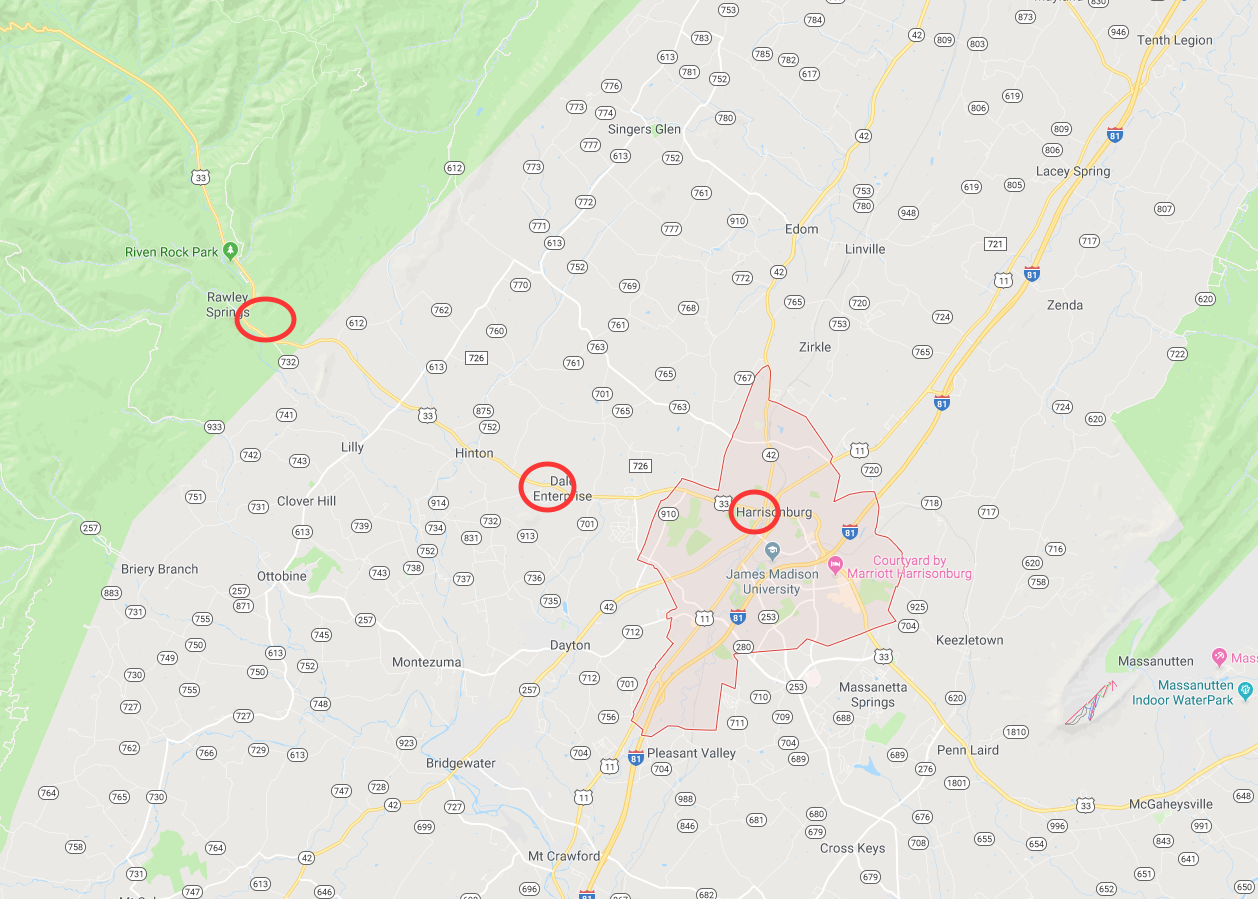 Field recorder was placed on a wall between two pillars (to reduce wind noise) on the south-facing steps of the courthouse building at the center of Court Square in downtown Harrisonburg, VA. This locations is 11.5 miles east of Rawley Springs, VA.